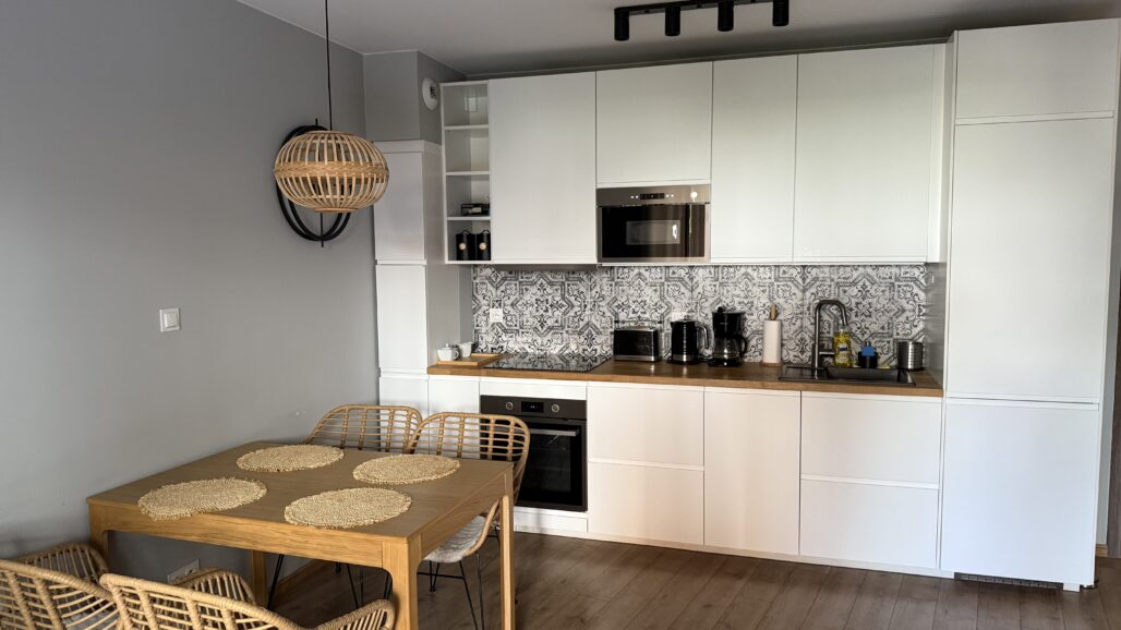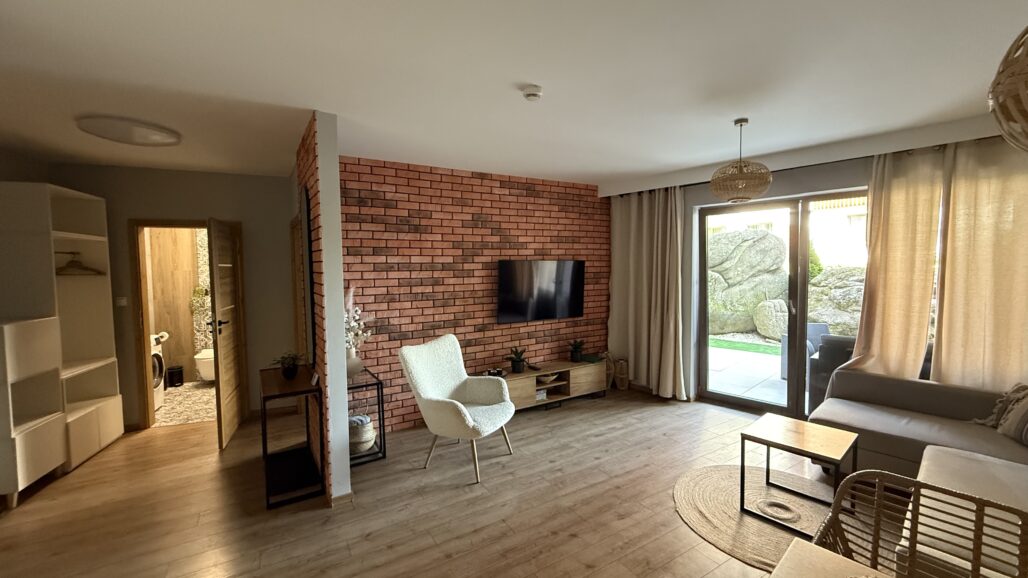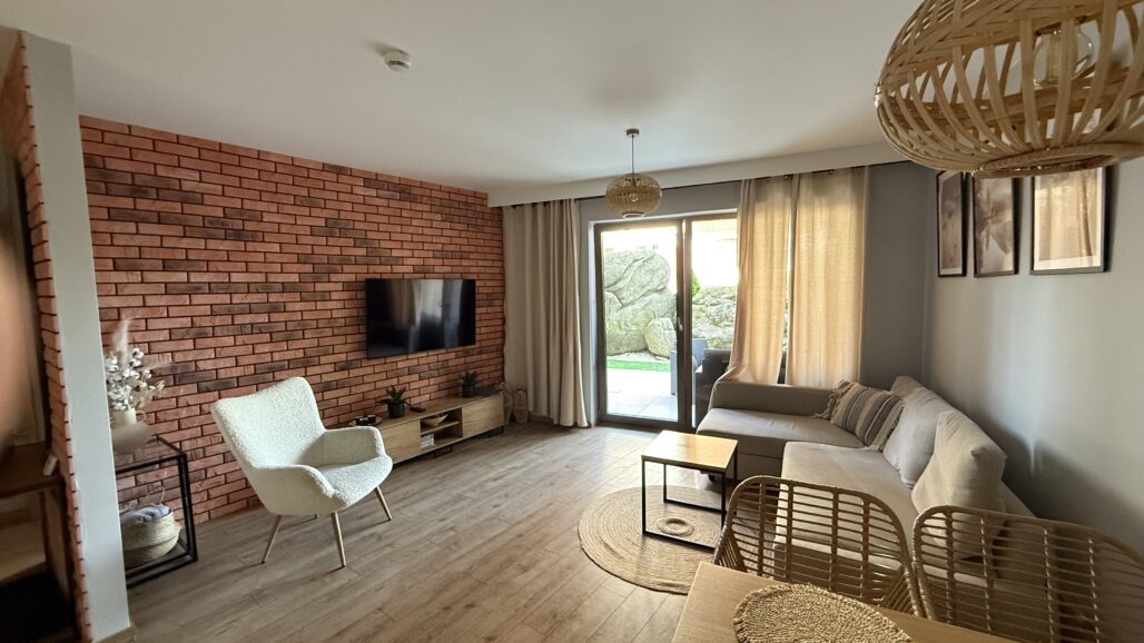 Wykończony i wyposażony apartament na parterze z dwom pokojami i prywatnym ogródkiem. Nowy właściciel nabywa gotowy produkt. Nie musisz zamrażać środków, czekać na zakończenie budowy i później stresować się wykończeniem apartamentu.